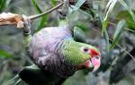 Крупный зеленый попугайчик с сиренево-синим опереньем на груди, брюшке и голове.