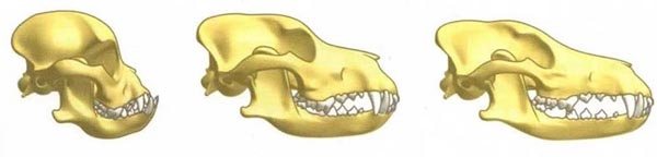 Три типа строения черепа. Слева — брахицефал, посередине промежуточный тип — мезоцефал (лабрадор, например), справа — долихоцефал (к примеру — афганская борзая).