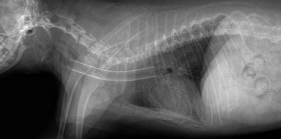 Независимо от изначальной стадии, коллапс трахеи может прогрессировать или осложняться отеками и воспалением вследствие аллергических, инфекционных заболеваний, болезней верхних дыхательных путей. И тогда, помимо кашля, появляются тревожные симптомы: хрипы, одышка или затрудненное дыхание, синюшность слизистых оболочек рта и языка. Коллапс трахеи ветеринарный врач может определить путем пальпации, оценивая форму трахеи в шейном отделе. Можно подтвердить коллапс трахеи рентгенологически, на снимке выявляется деформация и/или изменение просвета трахеи. Так же коллапс трахеи можно подтвердить эндоскопически (трахео / бронхоскопия) — путем визуального осмотра трахеи «изнутри» при помощи специального эндоскопического оборудования, данная процедура проводится под анестезией.