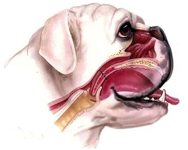 БРАХИЦЕФАЛЬНЫМ СИНДРОМОМ называется клинически значимое сужение верхних дыхательных путей (сужение ноздрей и носовых ходов + удлинение и/или утолщение мягкого нёба + деформация гортани и/или трахеи). Тяжесть состояния зависит от степени сужения, доходит до того, что слизистые ротовой полости становятся синюшными от недостатка кислорода. Сильная беспричинная одышка, хрипы и свисты на вдохе/выдохе, клокотание в горле — все это указывает на брахицефальный синдром, усиливаясь и усугубляясь при жаре, физической нагрузке, боли, стрессе.