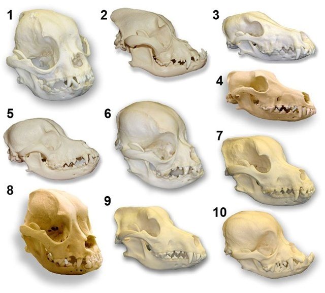 Черепа собак: 1 — бостонский терьер, 2 — боксёр, 3 — колли, 4 — персидская борзая, 5 — кокер спаниель, 6 — мопс, 7 — ротвейлер, 8 — французский бульдог, 9 — большая пиренейская, 10 — пекинес. Номера — 1, 6, 8, 10 — брахицефалы.