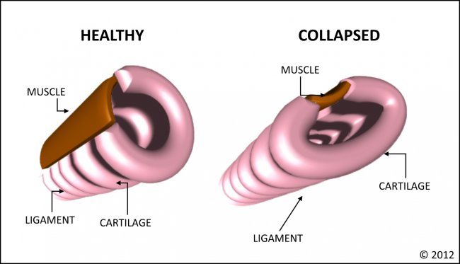 КОЛЛАПС ТРАХЕИ. На самом деле про коллапс трахеи нужно писать скорее в разделе «мелкие и миниатюрные породы собак», но тема близкая, а отдельного раздела по чихуахуа и йоркширским терьерам не предвидится. Поэтому будет про коллапс тут, тем более брахицефалы тоже страдают такой проблемой. Коллапс трахеи — это генетическое хроническое дегенеративное заболевание, связанное с деформацией колец трахеи (вследствие уменьшения их жесткости), когда хрящевые кольца как бы «сплющиваются» сверху вниз, из-за чего просвет трахеи вместо круглого становится полулунным. Это приводит к тому, что верхние и нижние стенки трахеи при дыхании соприкасаются, вызывая кашель. С другой стороны в результате коллапса в трахее развивается воспалительный процесс и усиливается секреция слизи, что тоже вызывает кашель. В основном к данному заболеванию предрасположены карликовые породы собак: большинство йоркширских терьеров, чихуахуа, той-терьеры, карликовые пудели, немецкий шпиц, некоторые брахицефальные породы, типа пекинеса и т.д. Возраст может быть любым, хотя у большинства собак клинические симптомы появляются в среднем возрасте. Коллапс трахеи бывает различной степени тяжести. Чем сильнее сплющены кольца, тем меньше просвет трахеи. При незначительных изменениях кашель может наблюдаться только при возбуждении, после физических нагрузок, в жару, при натягивании поводка, если на собаке ошейник. При более выраженных изменениях кашель наблюдается и в относительно спокойном состоянии, а иногда и в полном покое, собака может просто спокойно сидеть и вдруг начать заходиться в приступе кашля. При значительных изменениях, когда стенки трахеи почти постоянно соприкасаются, может доходить и до приступов удушья, и даже до летального исхода. Иногда коллапс трахеи может не вызывать клинических симптомов и быть обнаружен только при осмотре или случайно, на рентгенограмме.